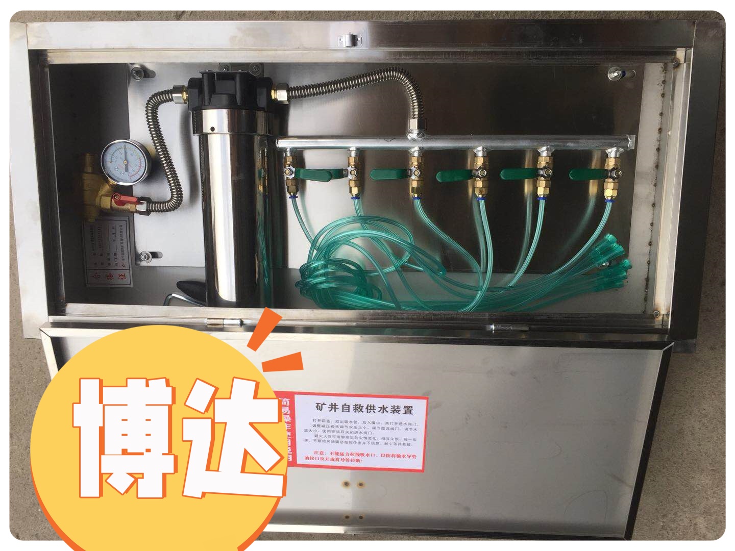 該裝置主要用于具有煤與瓦斯突出的煤礦井下救災(zāi)防護(hù)。箱式壓風(fēng)自救裝置安裝在煤礦井下銅室或采煤工作面的機(jī)風(fēng)巷進(jìn)頭的適當(dāng)位置或流動(dòng)人員較多的地方,以及溜子頭、井底車(chē)場(chǎng)、運(yùn)輸和回風(fēng)巷道、各種站房等地。當(dāng)發(fā)生巷道冒頂,煤與瓦斯突出時(shí)或有突出預(yù)兆時(shí),工作人員跑步進(jìn)入附近安裝有呼吸器的地點(diǎn)和場(chǎng)所避災(zāi),戴上呼吸器,等待救援。